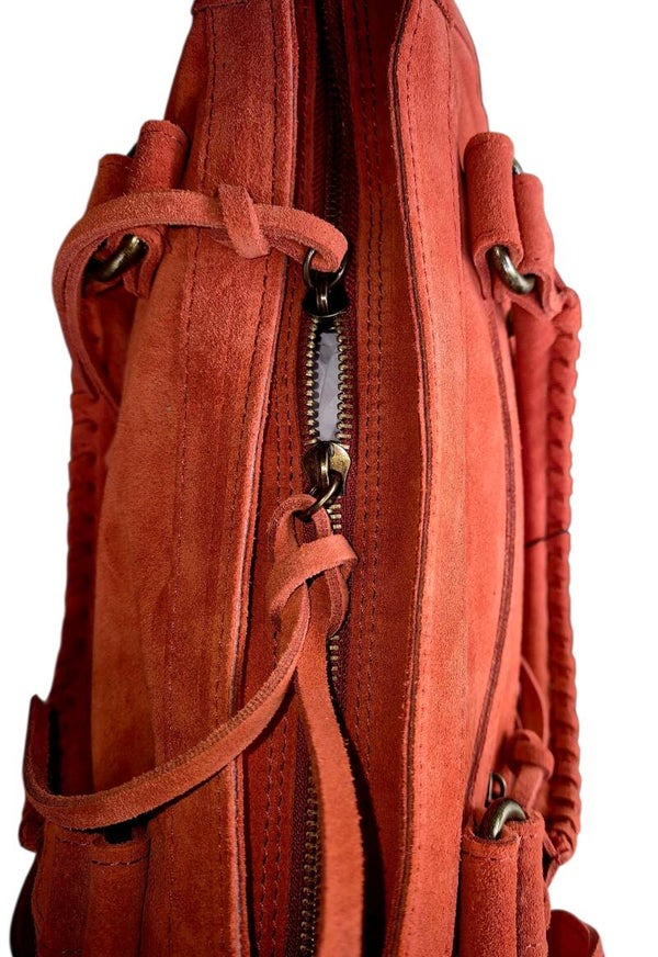Deze luxe Italiaanse tas van premium suède leer in Arancio onderscheidt zich door zijn tijdloze elegantie en verfijnd ontwerp, geïnspireerd door grote luxemerken.