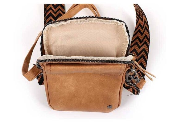 Dit stoere tasje Groet valt op dankzij de unieke schouderband. Is deze niks voor jou? Geen probleem, de tas wordt ook geleverd met een smallere effen schouderband. Omwisselen tussen de twee banden is zo gedaan. Beide banden zijn verstelbaar tot 130cm. Het tasje is te dragen als schoudertasje, of als crossbody tasje. Groet is een ideaal tasje voor een dagje weg of avondje uit!