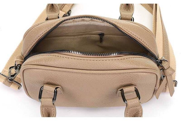 De ruime handtas wordt in zijn geheel gesloten wordt met een ritssluiting. Zowel aan de binnenkant als achterkant bevindt zich nog een met rits afsluitbaar insteekvakje.